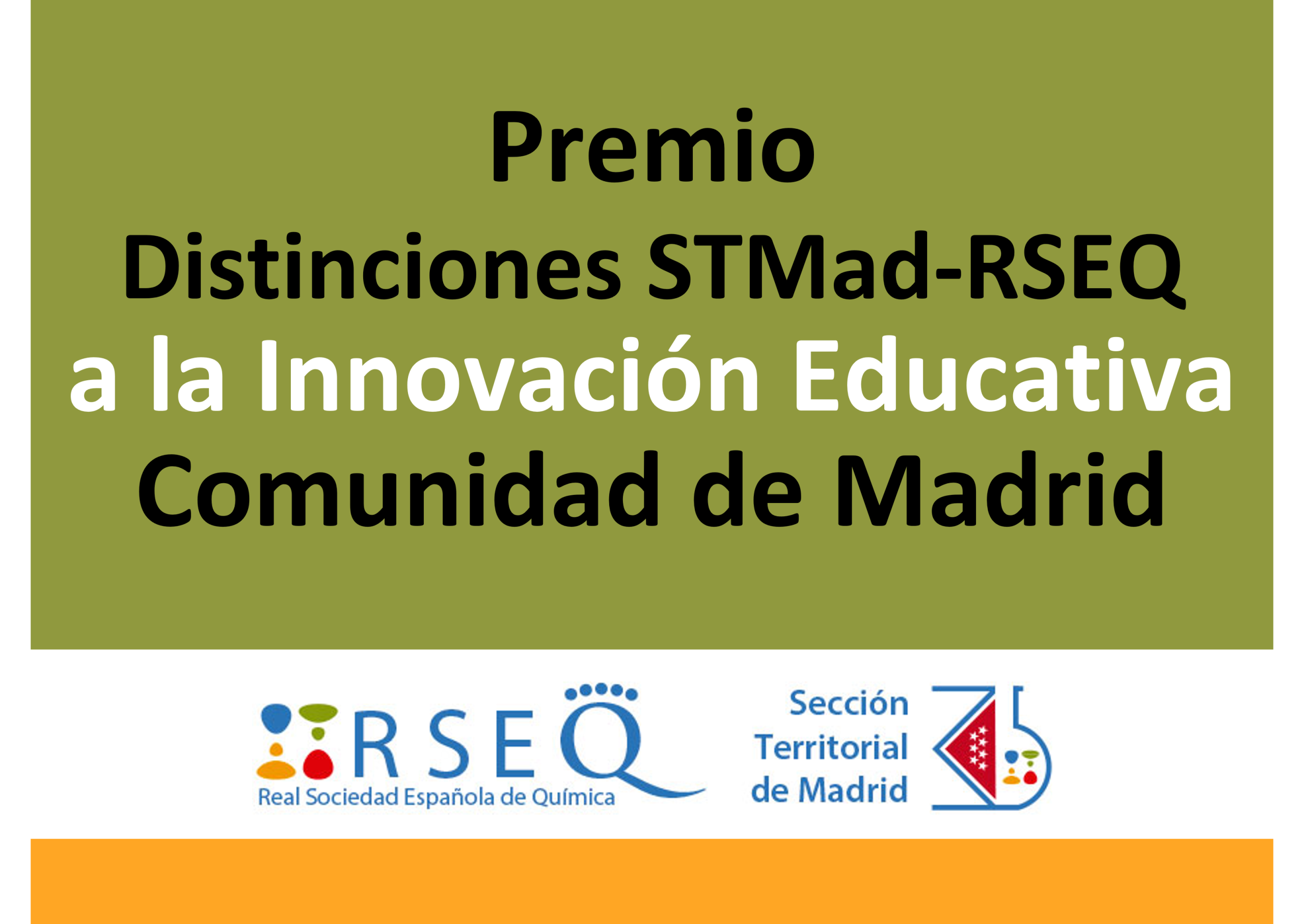 La Sección Territorial de Madrid de la Real Sociedad Española de Química (STMad-RSEQ) convoca la primera edición de los Premios a la Innovación Educativa en Química. Las personas galardonadas recibirán un premio y un diploma acreditativo. Los premios no llevan aparejada una dotación económica.